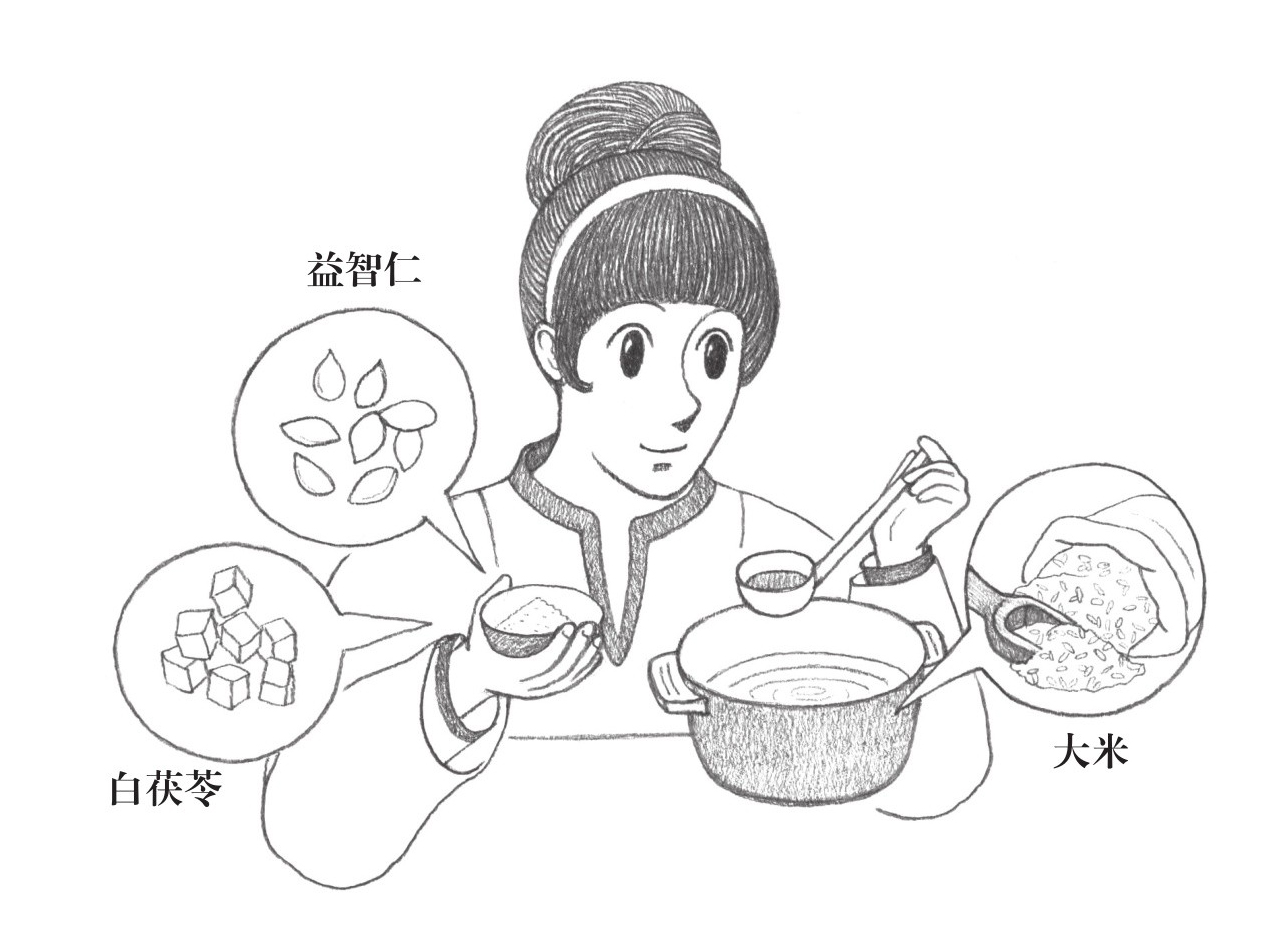偏方: 取益智仁30~50克,白茯苓30~50克,大米30~50克。先把益智仁同白茯苓烘干,一并研为细末备用;将大米煮成薄粥,待粥将熟时,调入药粉3~5克,稍煮即可。也可用米汤调药粉3~5克稍煮,趁热服食。每日早晚2次,连用5天。