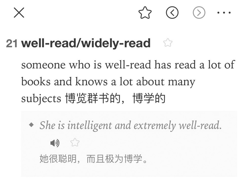 不是说 “她被好好地读了” ,而是说 “她极为博学” ,是表示“She has read a lot of books.”这样的主动含义。请看下面左图的朗文词典释义: