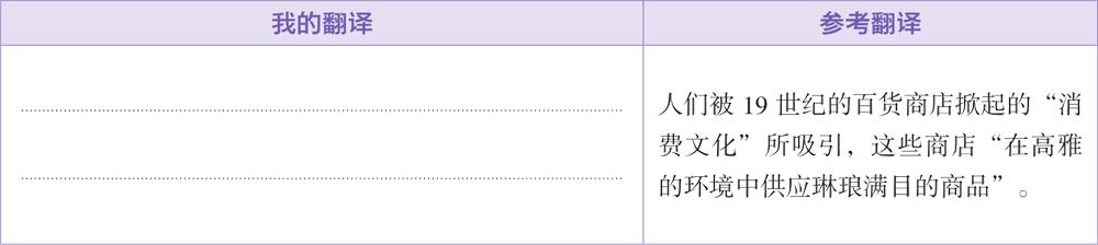 People are absorbed into “a culture of consumption” launched by the 19th-century department stores that offered “vast arrays of goods in an elegant atmosphere”. (24词)