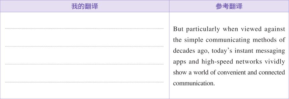 但尤其当与几十年前简单的通信方式对比来看时,如今的即时通讯应用和高速网络生动地展示了一个便捷、互联的通信世界。(英二2010年大作文)