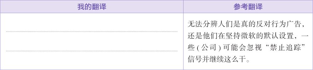 Unable to tell whether someone really objects to behavioural ads or whether they are sticking with Microsoft's default, some may ignore a DNT signal and press on anyway. (28词)