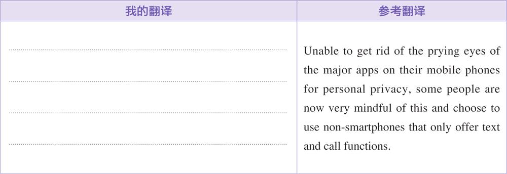 无法摆脱手机上各大APP对个人隐私的窥探,有的人现在对此非常的介意,选择使用只有短信和通话的非智能手机。(英二2010年大作文/英一2015年大作文)