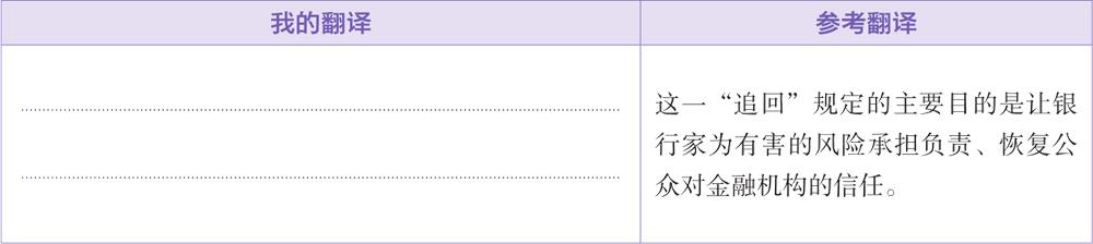 The main purpose of this “clawback” rule is to hold bankers accountable for harmful risk-taking and to restore public trust in financial institutions. (23词)