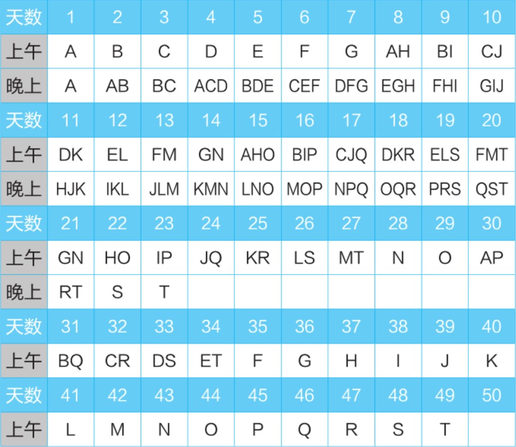 20 天搞定考研词汇 有些同学记忆力较为薄弱,每天背诵400个左右的单词确实困难,可采用以下表格,20天搞定考研词汇。下表中虽然列了50天,其实20天已经背完,20天之后只是重复、复习,保证不忘而已。字母A~T代表将本书分为20份,每个字母代表一个LIST。每天的工作量减半,但检查起来更为烦琐。实际上,第一遍背诵单词花费时间越少,重复起来越简单。