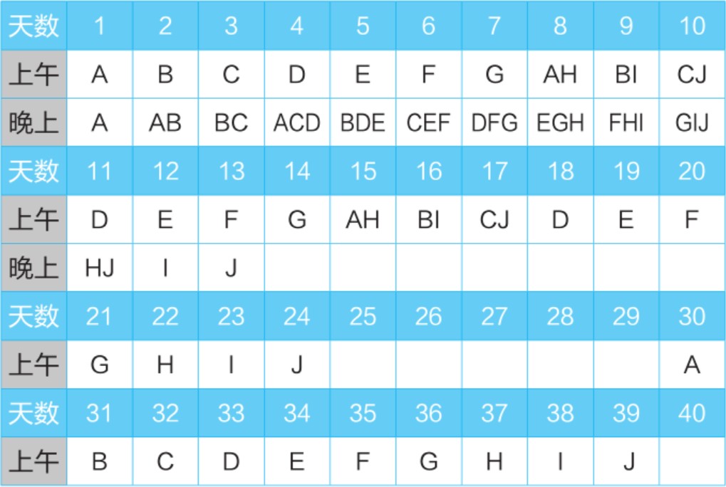 本表格中虽然列了40天,但是第10天已经基本背完所有词汇,见到每个单词几乎都可快速、准确地说出1~3项常考的中文含义,自信心瞬间爆棚,成就感油然而生,做题开始变得无比轻松。第11天之后只是重复,保证不忘而已。表格中数字代表天数,字母代表本书平均等分为十份。第一份为A,代表LIST 1~2;第二份为B,代表LIST 3~4;以此类推,第十份为J,代表本书最后一个部分:LIST 19~20。同时将艾宾浩斯记忆和遗忘曲线中的八大背词时间贯彻到底,即单词每隔5分钟、30分钟、12小时、1天、2天、4天、7天、15天,务必进行复习检查,否则前功尽弃,收效甚微。