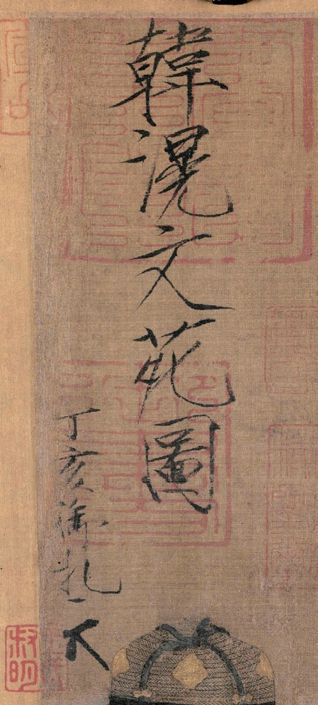作品左上方末尾处,有宋徽宗御笔“韩滉文苑图”,题字下方,还有宋徽宗“天下一人”的御笔落款;