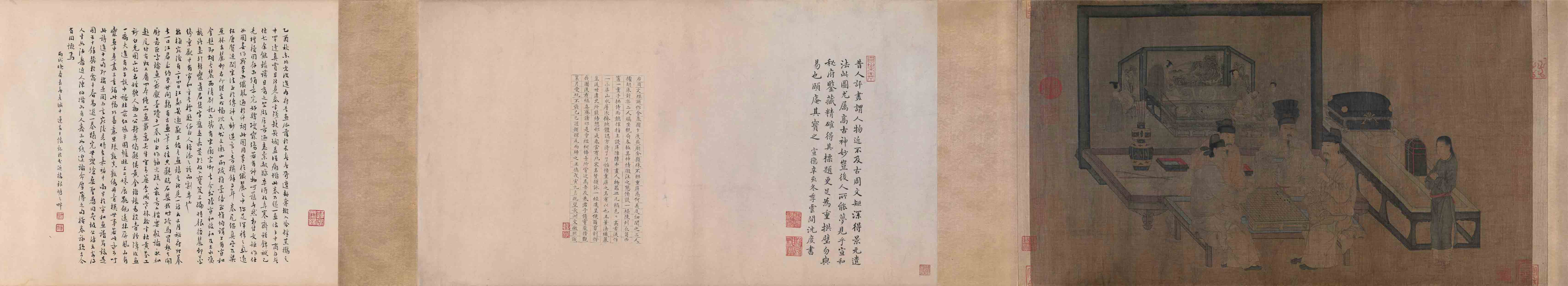 沈度写道“宣和秘府鉴藏精确,得其标题更足为重”,文徵明也提到“乍展徽庙金题,殊不解重屏为何义”,这就明确告诉我们此图在明代中期还保留着宋徽宗在卷首的金字标签,这与《琉璃堂人物图》情况类似。