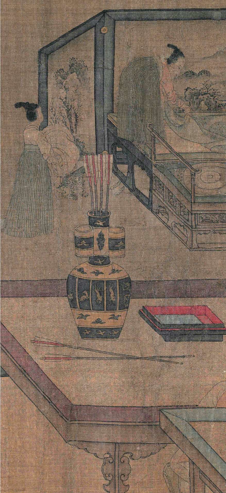 李璟和景遂坐在榻上,两人右侧后有投壶和箭镞,以及一个装果品的空盘子。这说明,在会棋之前,兄弟四人曾投壶游戏,并吃了一点东西 (见图2.18) ;