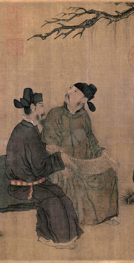 考虑到画作的钤印情况,这件摹本最晚出现于宋徽宗时代,并为宋徽宗内府收藏。但是,画面人物为南唐中主李璟和他的兄弟们。他们是后周-北宋帝国要征服的对象,也是宋人相当看不起的人。李璟对北周称臣,李煜对北宋称臣,并自去帝号。在宋人眼里,南唐是一个不配使用“唐”这么个国号的割据政权,它只配叫“江南”,而它的皇帝,只配叫“国主”。