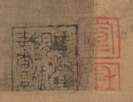 此印与我所见过的其他宋徽宗双龙印,在印面上有一定差距。若对比台北故宫博物院藏《山鹧棘雀图》、北京故宫藏《琉璃堂人物图》《芦汀密雪图》上的双龙方印,我们会发现,《重屏会棋图》上方印的印面与之皆不同。此外,《重屏会棋图》上双龙印左侧被切掉的部分较少,对比其他三方宣和时代的骑缝印来看——后者约有四分之三的印面被切去了。所以,我以为这里的印章是后人伪钤,而非原装钤印。至于是谁、钤于何时,尚无定论,但肯定是在明代中期文徵明见过这件画作之后的事情了。