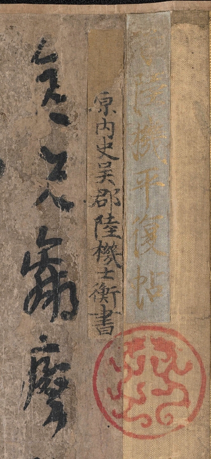 以金字题签的情况,在宣和装作品中是有先例的,并非此图一家特例。比如西晋陆机《平复帖》也是这种情况 (见图2.7) 。就从书法字体来说,两处题签书体也有不同。《平复帖》书体是典型的瘦金体,而《文苑图》用笔则较为饱满,不似瘦金体一般尖锐铿锵。但从文字结构上来说,画面上两处题签文字的书写较为统一,唯独“韩”字书写不同。