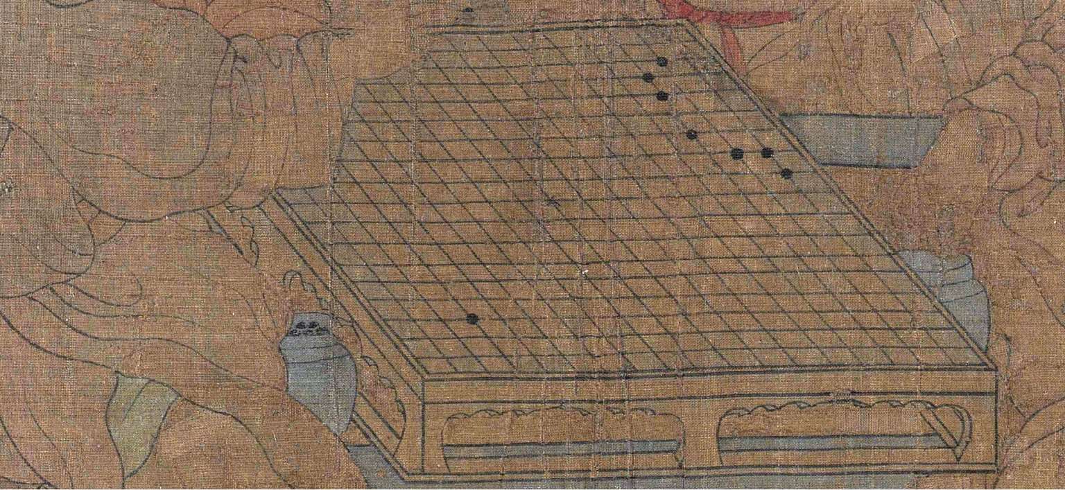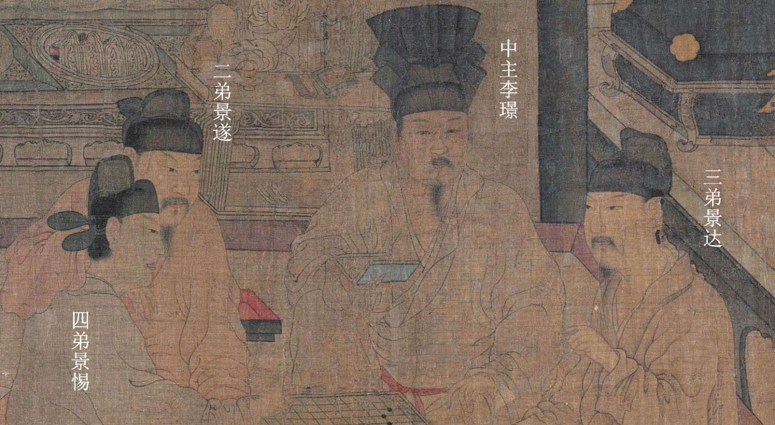 画面中高帽观棋的便是中主李璟。李璟左侧的景达,右侧第一个是李璟的二弟,晋王景遂。李璟和景遂的坐法有“一字并肩王”的意思。保大二年(944),李璟请景遂入宫主政,因为一些大臣努力劝阻,此事才不了了之。但是,保大五年(947),李璟立景遂为太弟,确立为自己皇位的继承人。这个坐法正好说明了景遂的身份和地位。李璟右侧第二个是景惕。从画面人物面貌来说,李璟右二人物没有胡须,说明年纪较轻,这与景惕在画面兄弟中年纪最轻的情况相符合。对弈者为齐王景达和江王景惕。