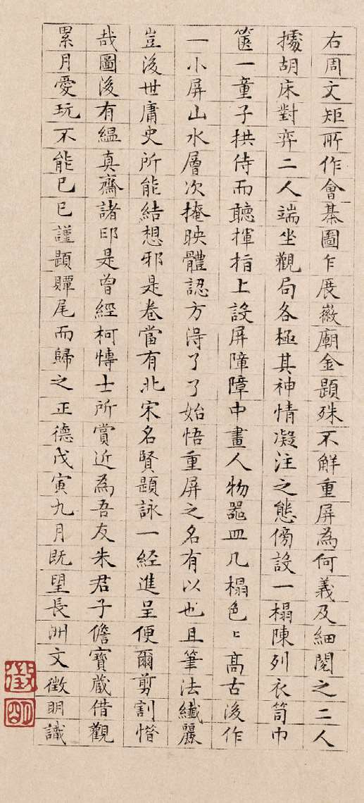 《重屏会棋图》现藏于北京故宫博物院,是一件传承有序的书画文物。此图绘制人物四人对弈,右侧卷首有一小童侍立。画面中有一座巨大的屏风,上绘人物和一座三折屏 (见图2.11) 。所谓“重屏”之名,便是从这里而来。关于命名问题,文徵明在卷末第二跋中写道:“右周文矩所作会棋图,乍展徽庙金题,殊不解重屏为何义,及细阅之,二人据胡床对弈,二人端坐观局,各极其神情凝注之态,旁设一榻,陈列衣笥巾箧,一童子拱侍而听挥指。上设屏障,中画人物器皿几榻,色上高古,后作一小屏山水,层次掩映,体认方得了了,始悟重屏之名有以也。”此外,文徵明这段题跋,也将画面中的物象交代给了大家 (见图2.12) 。