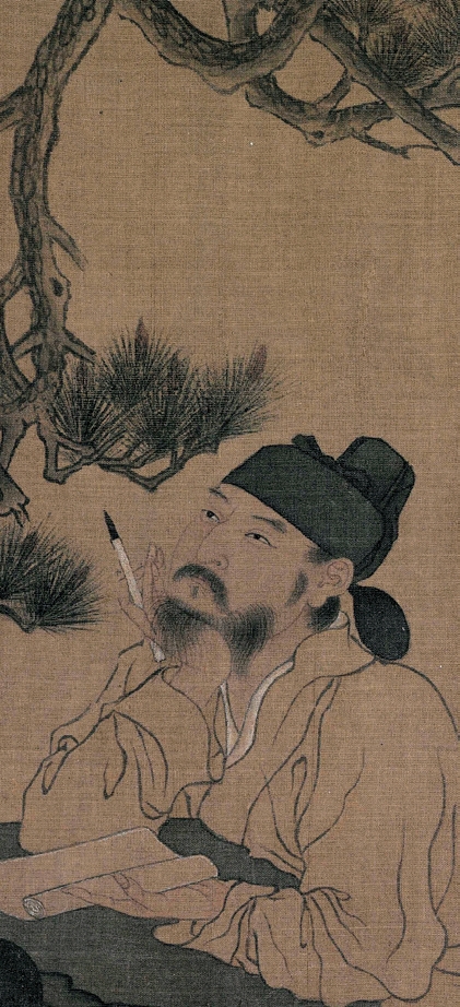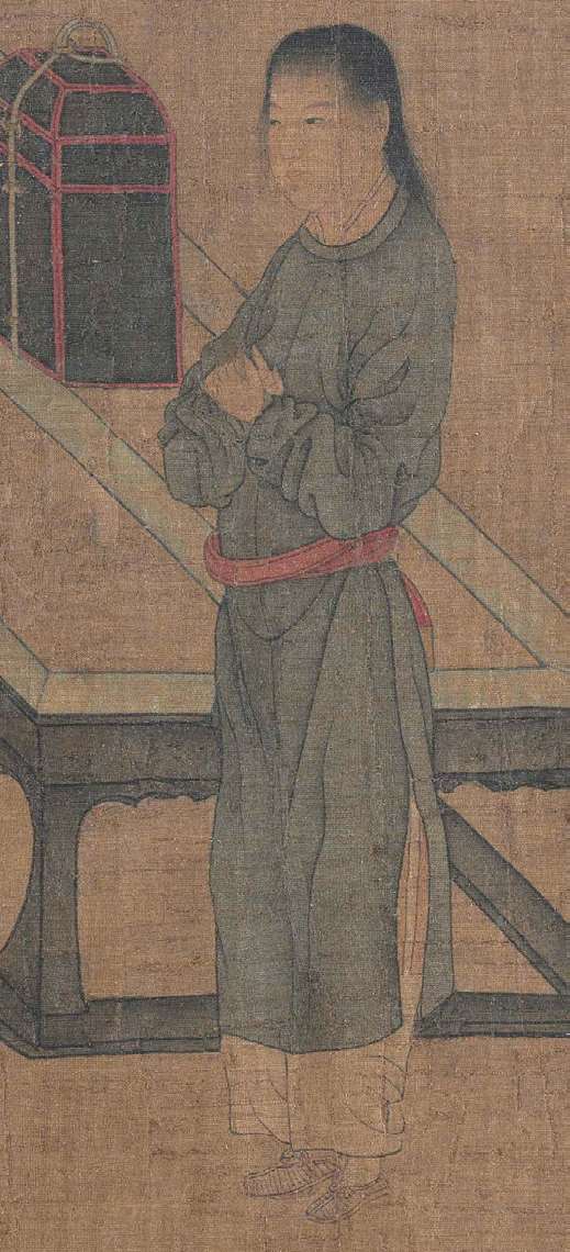 此图作人物五人,其中仆人一人,处于画面右二位置,正在为主人研墨。他的主人,右手夹着毛笔、托着下巴,左手拿着纸卷,应该正在思考,接下来能写点什么。他的神态也印证了这个情况 (见图2.2) 。