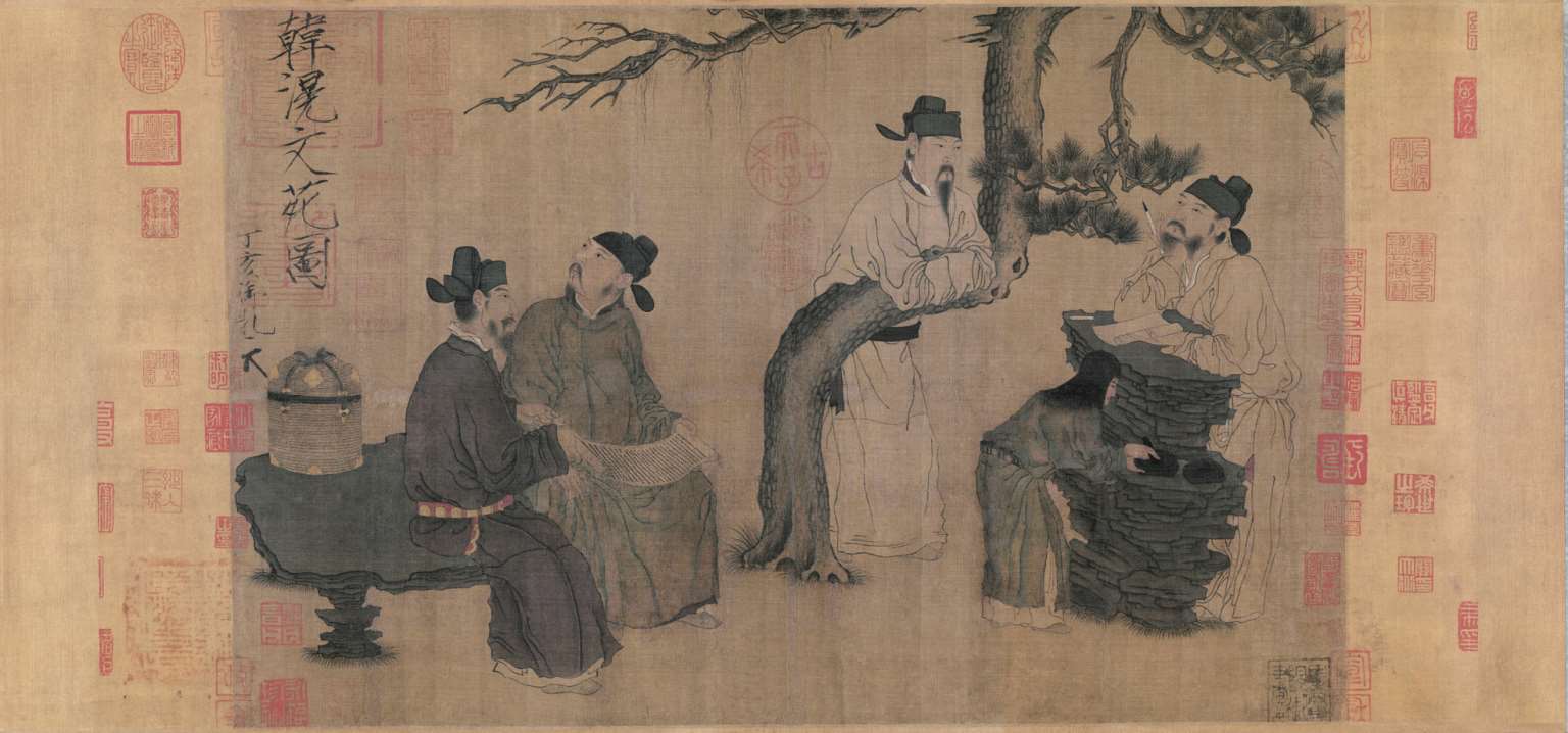 但是,《宣和画谱》成书于宋徽宗朝。这本书里都没记载内府收藏过韩滉的《文苑图》,而宋徽宗还御笔题写了鉴定意见,认为这件作品是韩滉真迹无疑,这就产生了矛盾。