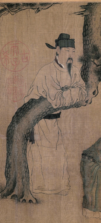 在他的不远处,有一位倚松而立、双手插袖的男子,他面容清秀而长髯飘飘,气质颇佳 (见图2.3) 。