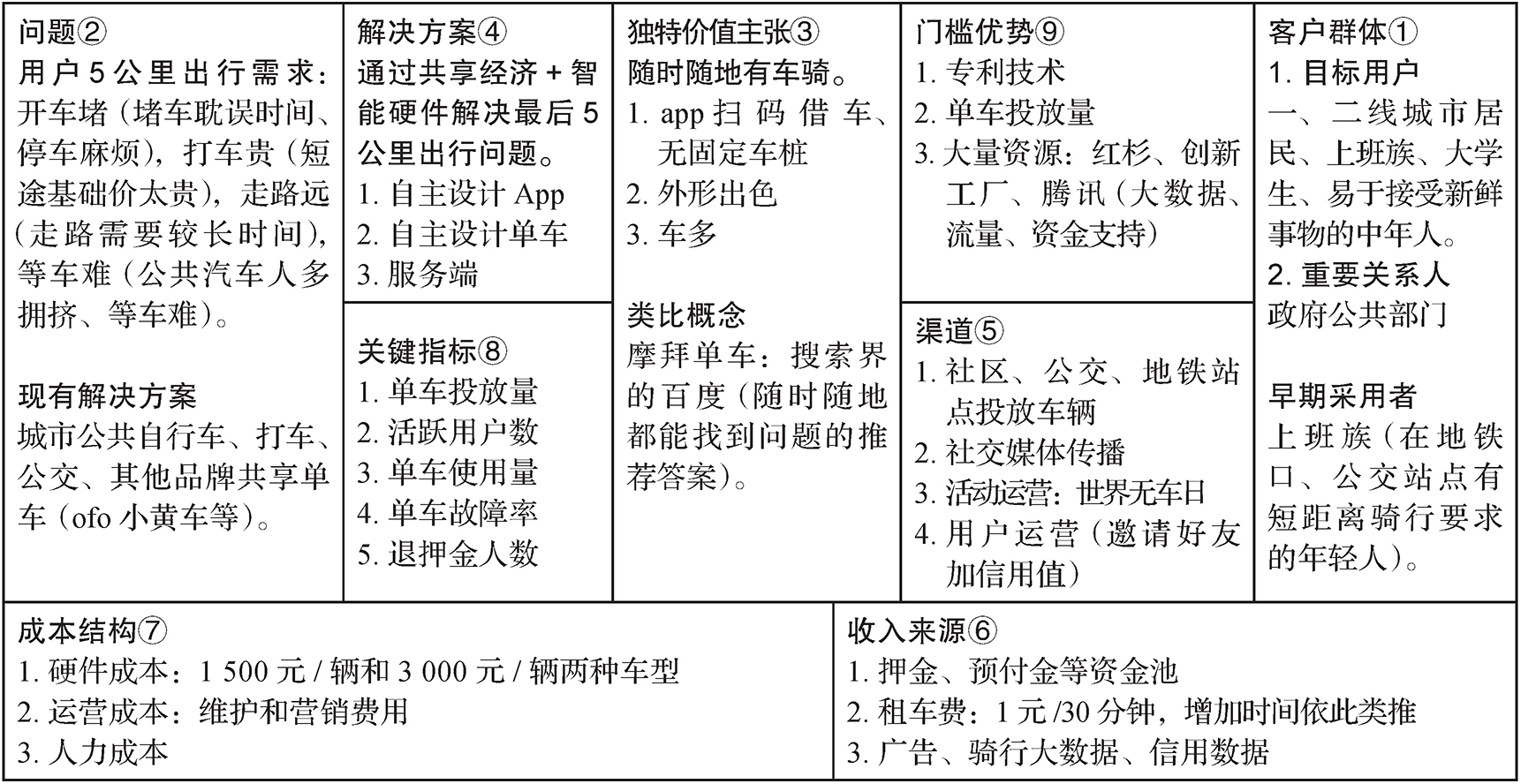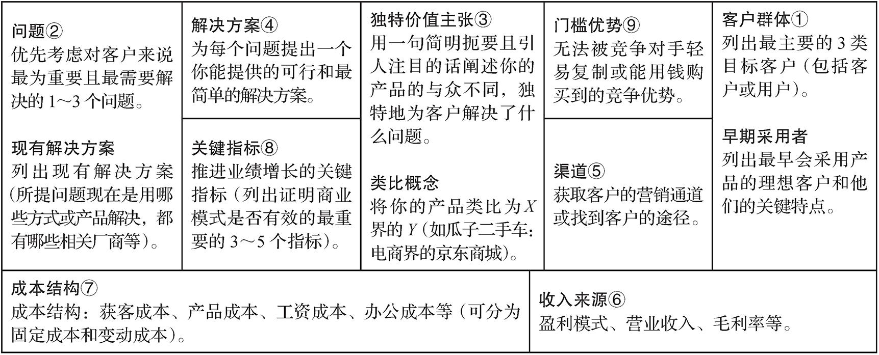 6.精益画布是促进创意成形和研讨商业模式的重要分析工具,它包括客户群体、问题、独特价值主张、解决方案、渠道、收入来源、成本结构、关键指标和门槛优势九部分内容。