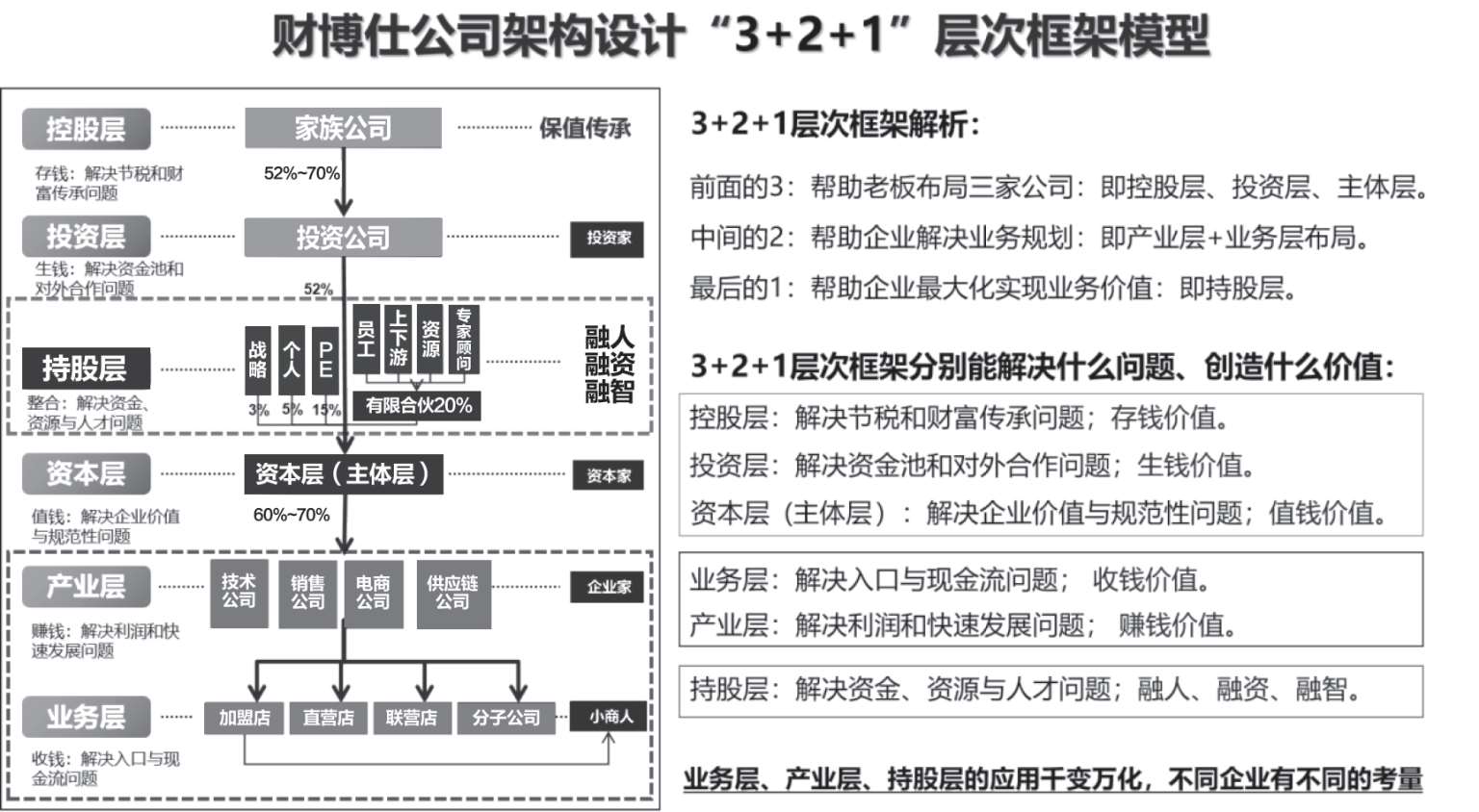 初创型企业通常规模较小、资源有限,商业模式尚未真正成熟,直接套用“公司架构设计 3+2+1 层次框架模型”往往不合适,因此,初创阶段不一定成立多家公司。