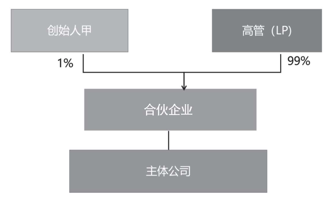 股权比例方面,普通合伙人的股权比例通常较小,出资少,有限合伙人的股权比例往往根据其出资额来确定,是合伙企业资金的主要来源。比如,有限合伙企业,创始人甲(普通合伙人)占股 1%,高管(有限合伙人)占股 99%。如图 3-7 所示。