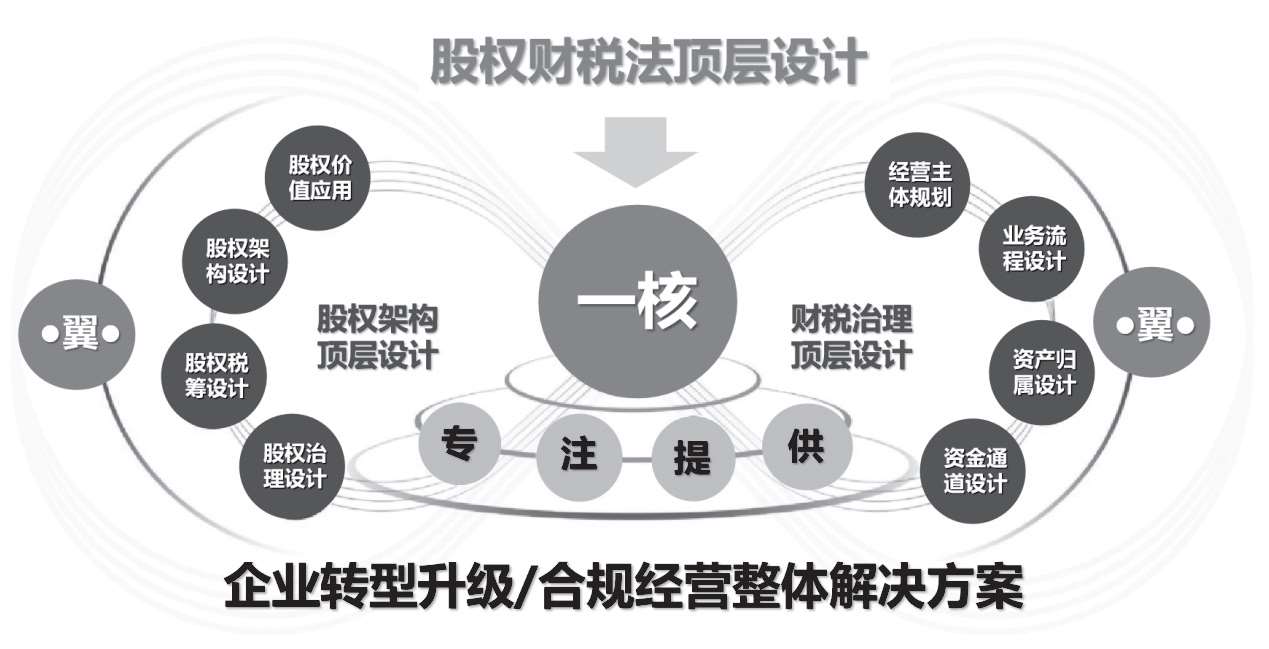 为实现企业“多层次股权架构设计”的商业版图,实现企业基业长青的目标,财博仕财税以“股权财税法顶层设计”为核心,以“股权架构顶层设计”与“财税治理顶层设计”为两翼,专注为企业提供转型升级及合规经营整体解决方案。