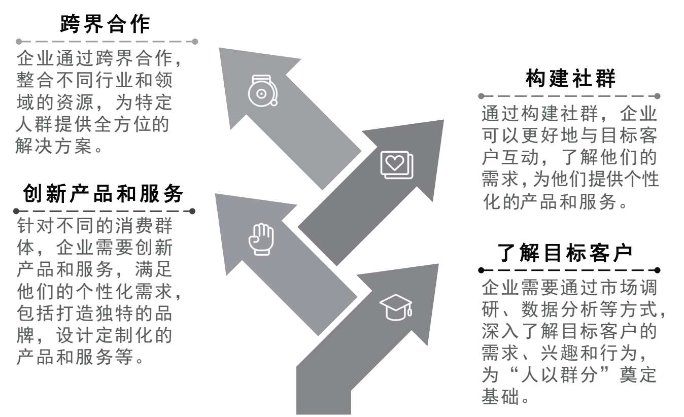 为了更好地满足消费者需求,商业模式正在向“人以群分”的方向转变。这种模式的特点是精准定位和个性化服务,即企业通过对消费者进行细分,提供更加符合不同人群需求的产品和服务来获取竞争优势。这种模式的优势在于能够更好地满足消费者需求,提高品牌忠诚度,创造更大的价值。