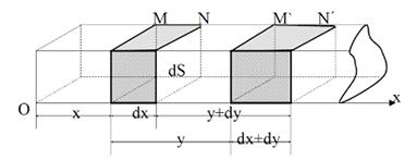 设体积元左端因振动而产生的位移为y(M→M´),体积元发生位移后的长度变化量为dy,则右端的位移为y+dy(N→N´),见图1-2。