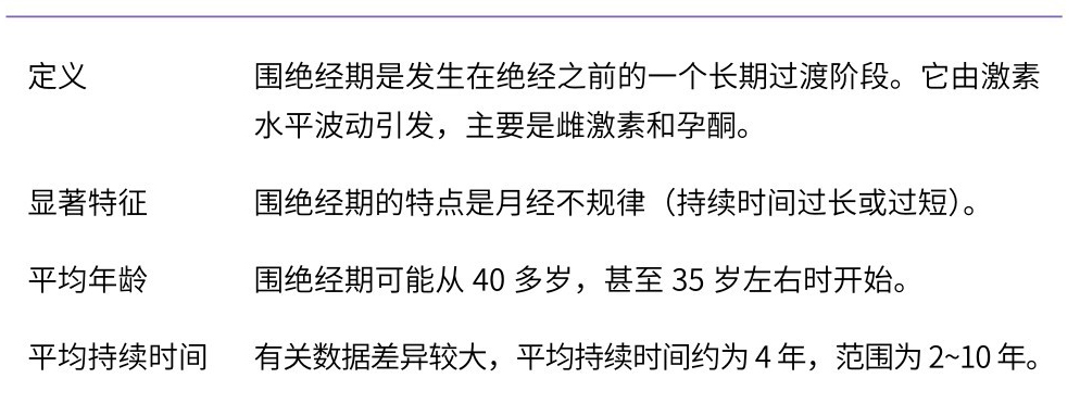 现在,我们来看看更年期各个阶段的一些显著特征,以及哪些因素会影响更年期进程。