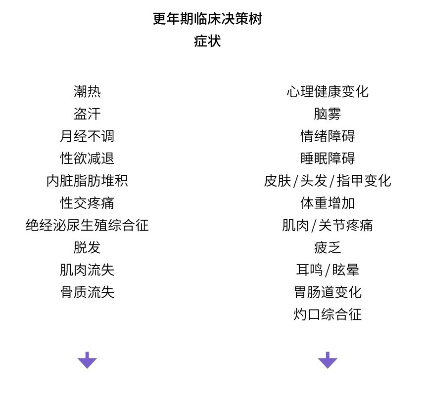 当我的病人出现疑似与围绝经期有关的症状时,我会遵循一种树状临床诊断图,它有助于排除其他可能存在的病症。你可以从更年期临床决策树中看到我是如何为患有上面所列症状的患者提供支持的。左边列出的症状,从“潮热”开始,是我们已知激素疗法会有所帮助的症状;右边是我们认为激素疗法可能会有所帮助的症状。当然,我会根据具体情况来管理每位患者,但大多数情况下,诊断时提出的问题都是相同的。由于围绝经期激素水平波动相当大,一次性血液、尿液或唾液检测都无法做出准确诊断。我会根据患者的症状做出诊断,并且常常配合血液检查来排除可能导致这些症状的其他原因,这在医学上称为排除诊断。