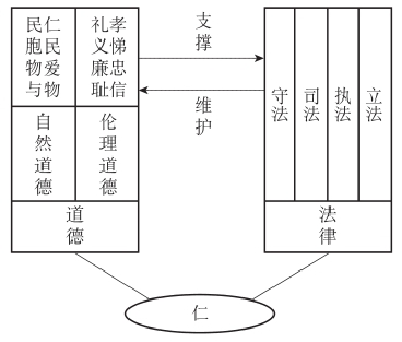 人伦道德抑或自然道德,都不过是人心的外化;要维护这些道德,就得有相应的法律制度。欲维护人伦秩序,就有了伦理法律制度;要维护自然秩序,就有了生态法的规范。或者说,只有根据这些道德要求来制定和实施的法律制度,才能符合人心、激发良知,才是良法;反之则不然。中华法系的演变发展,正体现了这样的思维逻辑和实践逻辑。故简而言之,“仁”就是中华法系的文化基因(见图0-1)。