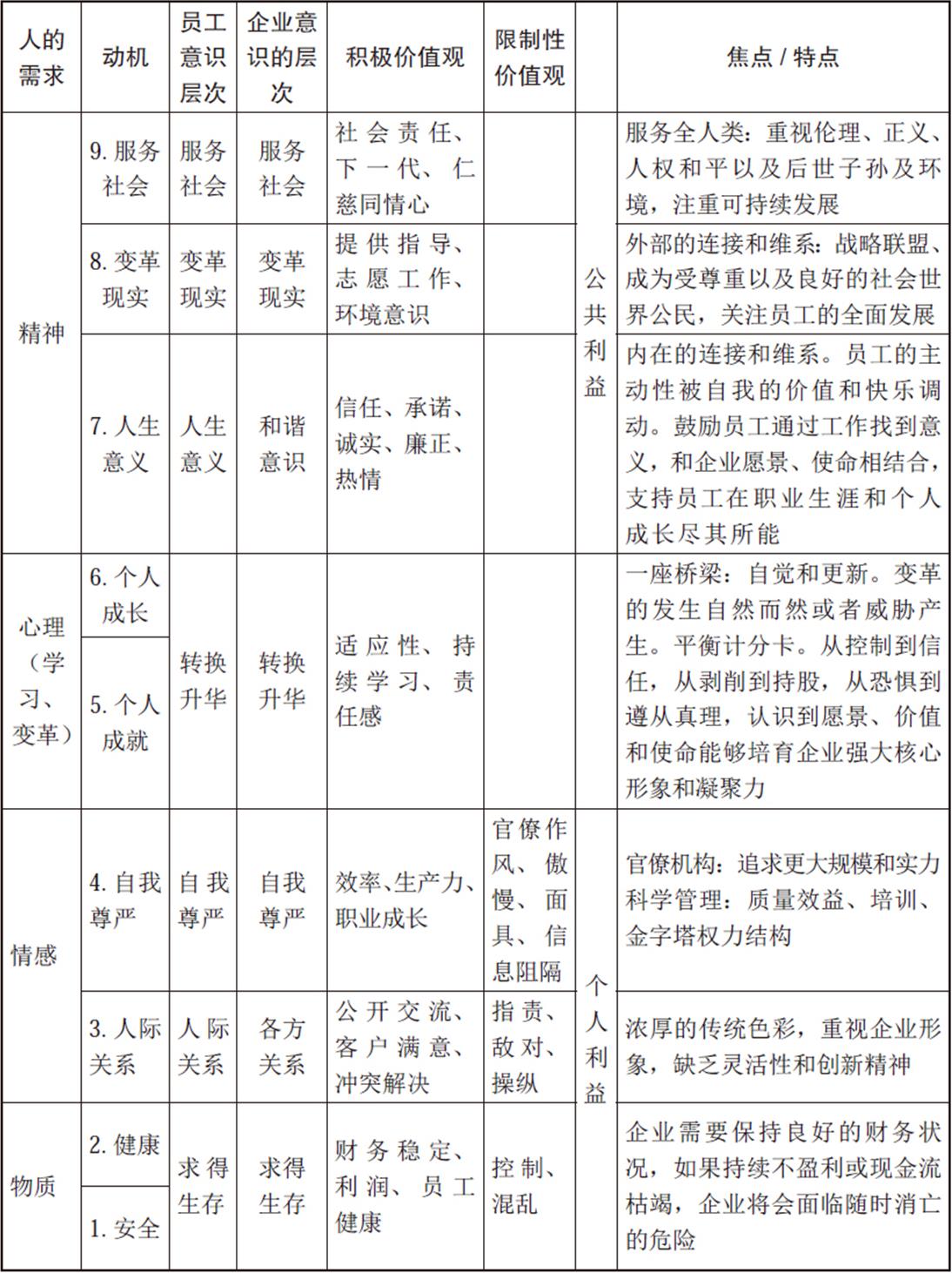 理查德·巴雷特是研究企业文化和意识层次的专家,他的研究将个人需求和企业意识层次整合在一起。通过他的模型,我们知道企业文化有层次高低之分,其特点如表5-1所示。