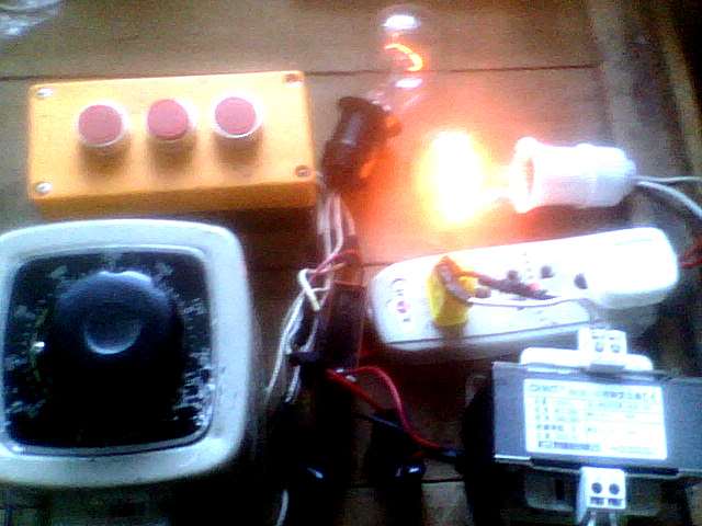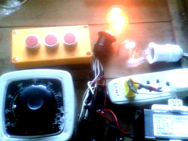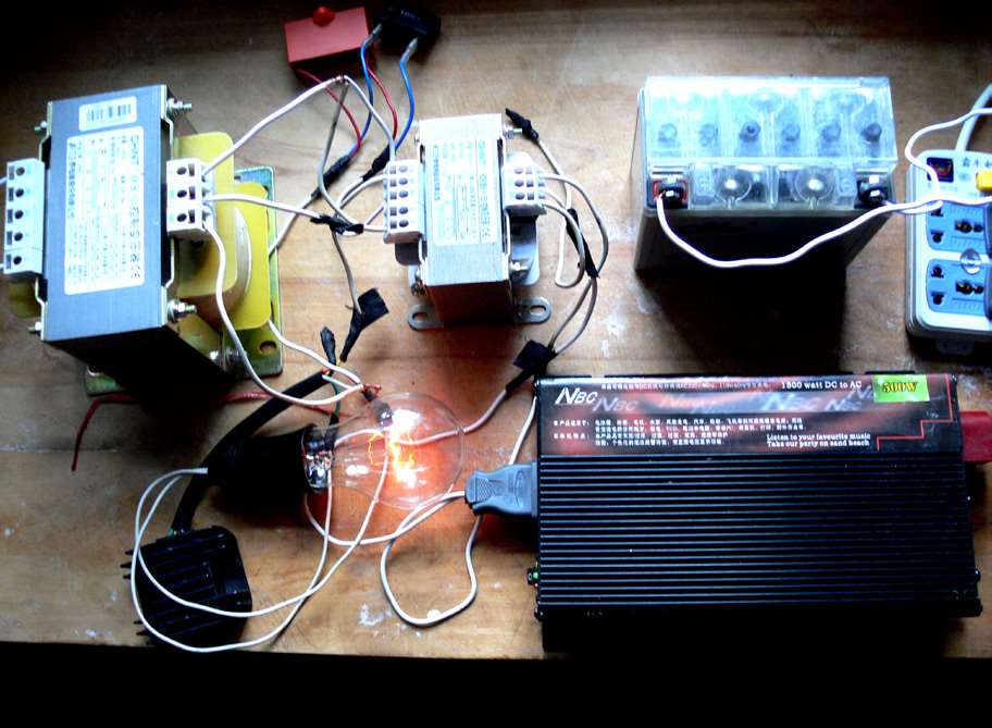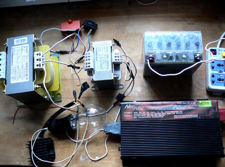 一、试验元件:(1)12伏电池,(2)500瓦全正弦逆变器,(3)150伏安变压器,输出端380伏做电抗器,(4)整流器,(5)电容器12微法,(6)用电器200瓦灯泡