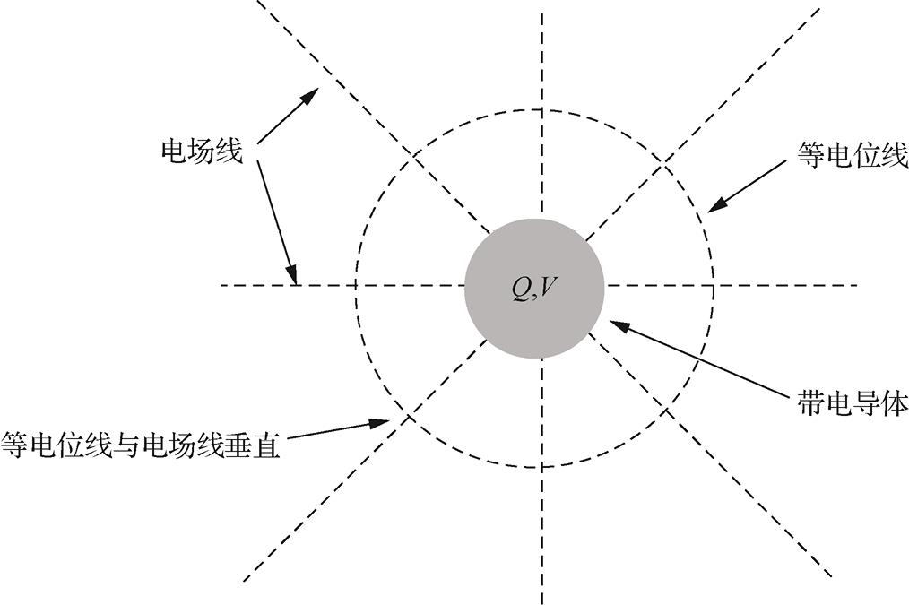 如图1.1所示,球形带电导体的电压为 V 。图1.1所示的每个点都具有一定的电位,电位的大小取决于将一个单位电荷移动到该位置所需的功。如果将图1.1所示的等电位点连接起来,就形成了等电位线(三维空间中则形成等电位面)。如同在地图上画出山丘的等高线一样,将电位按照强弱高低勾勒出轮廓,可以标记出一系列等电位面。等电位线始终与电场线垂直(呈90°夹角)。