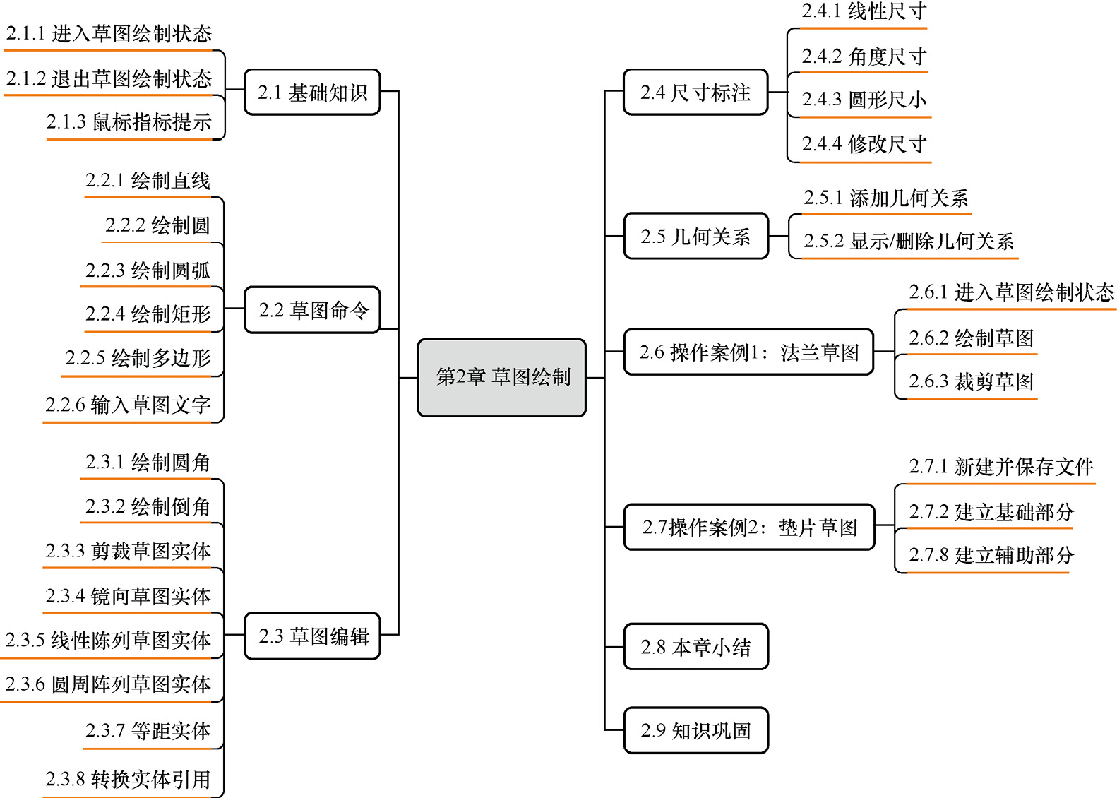 本章主要介绍草图绘制,内容包括基础知识、草图命令、草图编辑、尺寸标注、几何关系及草图绘制案例。二维草图是建立三维特征的基础。
