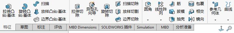 在SOLIDWORKS中,【特征】工具栏直接以选项卡的形式显示在操作界面的上方,如图1-16所示。