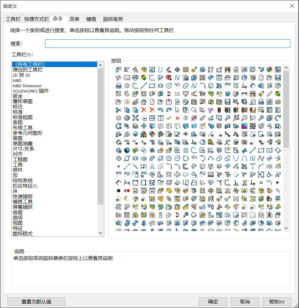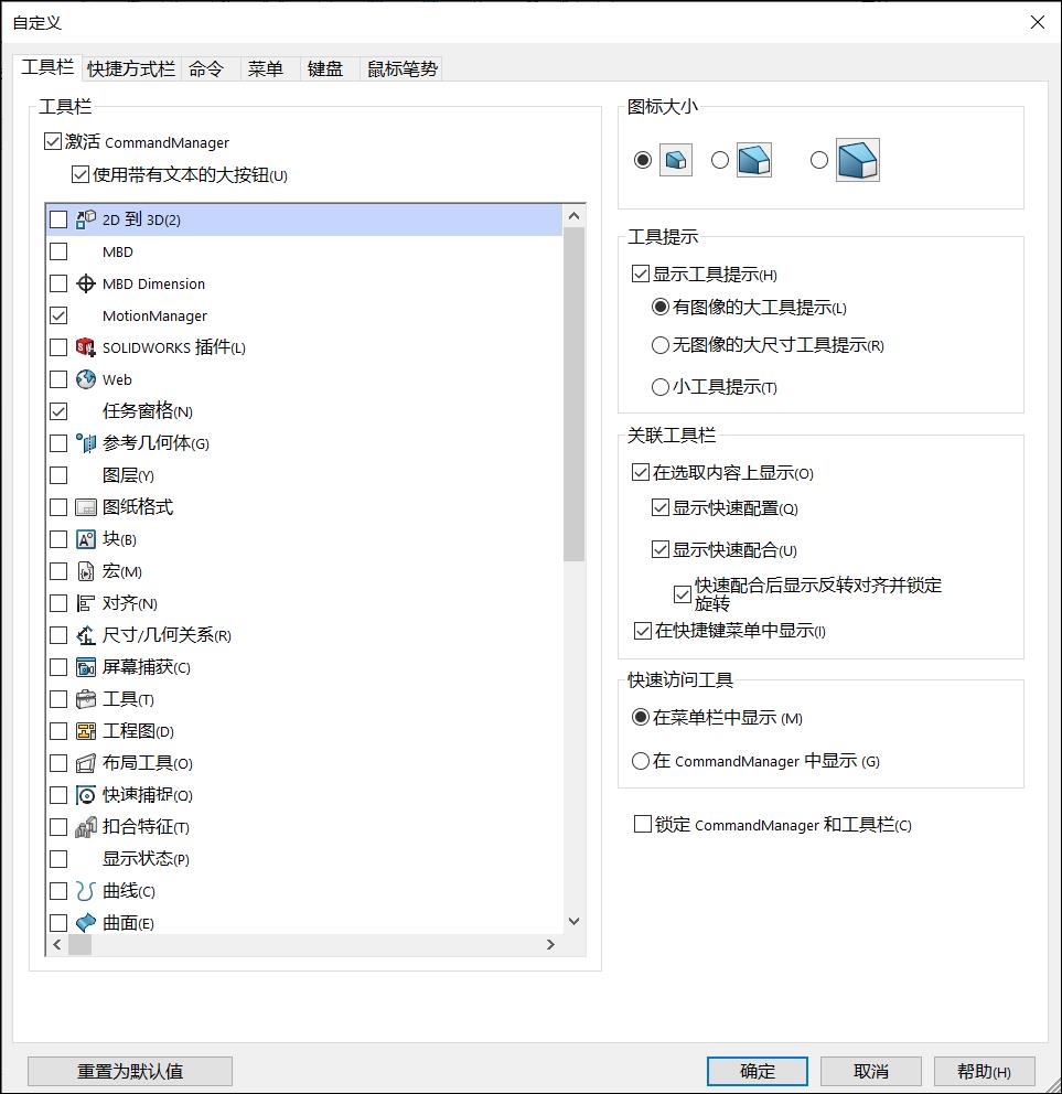用户可根据文件类型(零件、装配体或工程图)来设置工具栏,并设置想显示的工具栏及想隐藏的工具栏。自定义工具栏的操作如下。