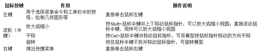 鼠标在SOLIDWORKS中的应用频率非常高,可以用其实现平移、缩放、旋转、绘制几何图形和创建特征等操作。基于SOLIDWORKS的特点,建议使用三键滚轮鼠标,在设计时便于提高设计效率。表1-1列出了三键滚轮鼠标的使用方法。
