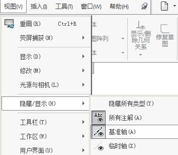 选择菜单栏中的【视图】|【隐藏/显示】|【基准轴】命令,可以看到命令左侧的按钮下沉,如图1-29所示,这表示基准轴可见(再次选择该命令,该按钮将恢复为隐藏基准轴的显示)。