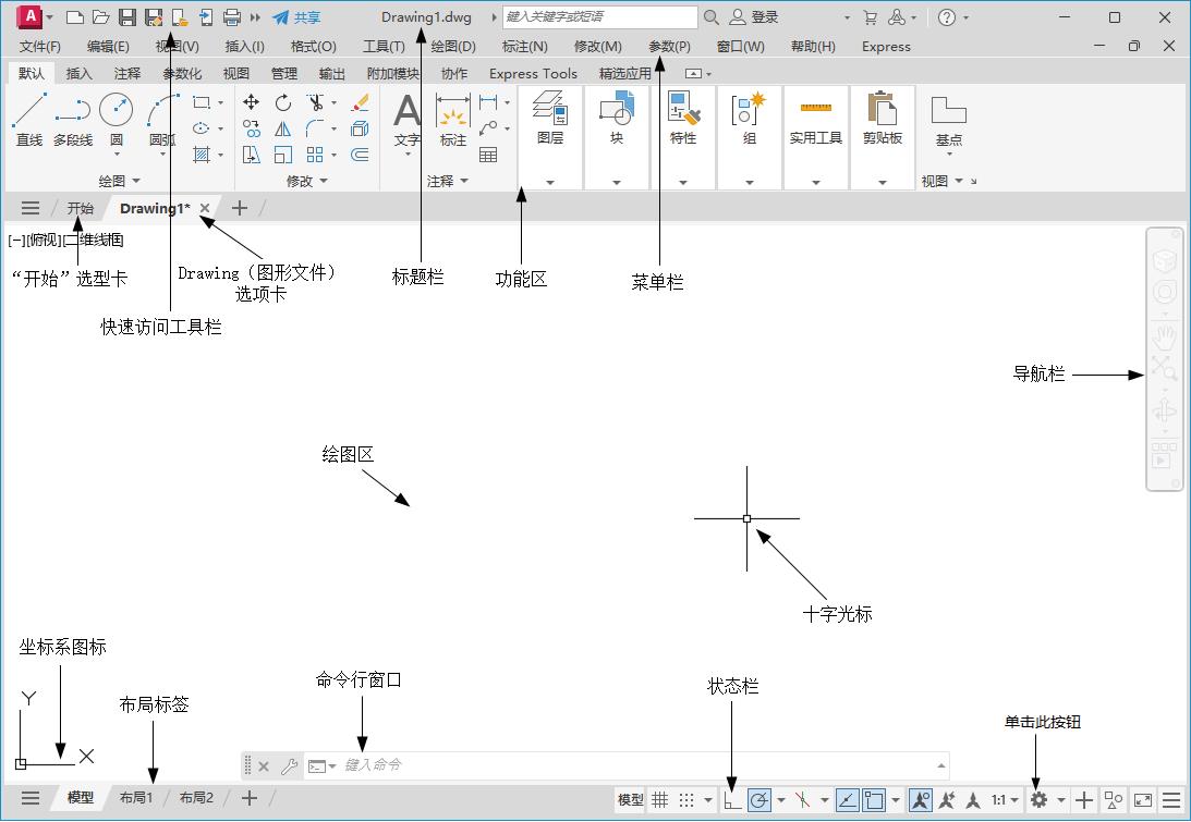 AutoCAD经典风格的界面包括标题栏、绘图区、十字光标、菜单栏、导航栏、坐标系图标、命令行窗口、状态栏、布局标签和快速访问工具栏等。