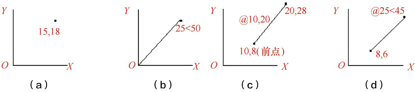 例如:在命令行中输入“15,18”,则表示输入了一个 X 、 Y 坐标值分别为15、18的点,此为绝对坐标输入方式,表示该点的坐标是相对于当前坐标原点的坐标值,如图1-24(a)所示。如果输入“@10,20”,则为相对坐标输入方式,表示该点的坐标是相对于前一点的坐标值,如图1-24(c)所示。