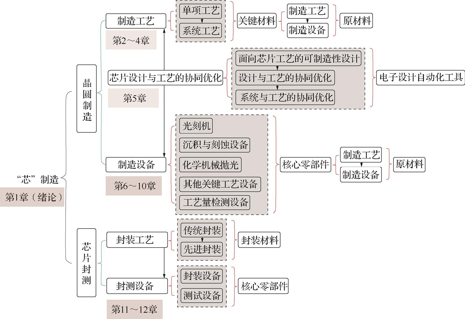 本书以集成电路制造业的前沿技术为核心,以全产业链为主线,深入介绍从上游到下游的各个环节,并进一步细化这些环节。本书聚焦基础问题与核心技术,打破学科界限,强调软件与硬件的融合,整合多学科知识,并梳理产业结构,绘制出涵盖集成电路制造及其相关服务的完整技术图谱。本书整体结构和内容要点如图1所示。