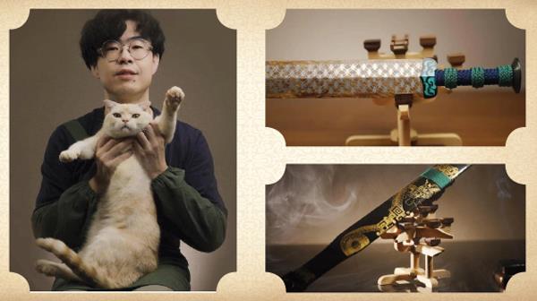 经历了144道精密工序的锤炼,猫木匠完成了“天下第一剑”的复刻作品以及他本人原创的剑鞘。