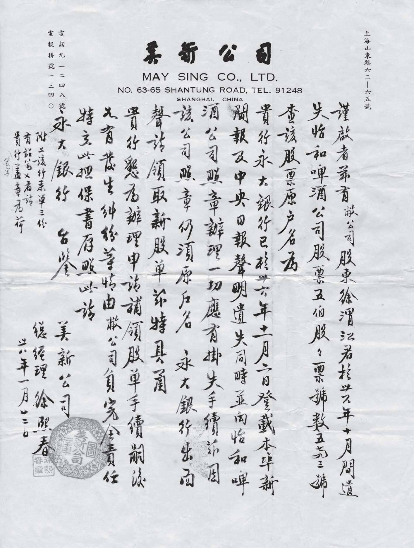 ▲1949年1月22日,徐熙春因次子徐渭江在1947年遗失永大银行股票挂失补办未果后写信请银行补办手续,此为其留下的最完整的毛笔手书