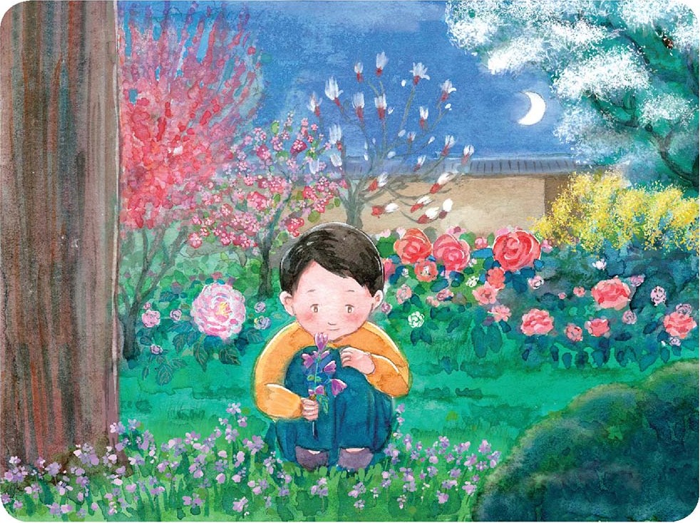 忽然间,花园的角门开了,一个小男孩飞跑进来,他没有看那月光下的万紫千红,却一直跑到松树背后的一个不受人注意的墙角,在那如茵的绿草中间,采摘着野生的二月兰。