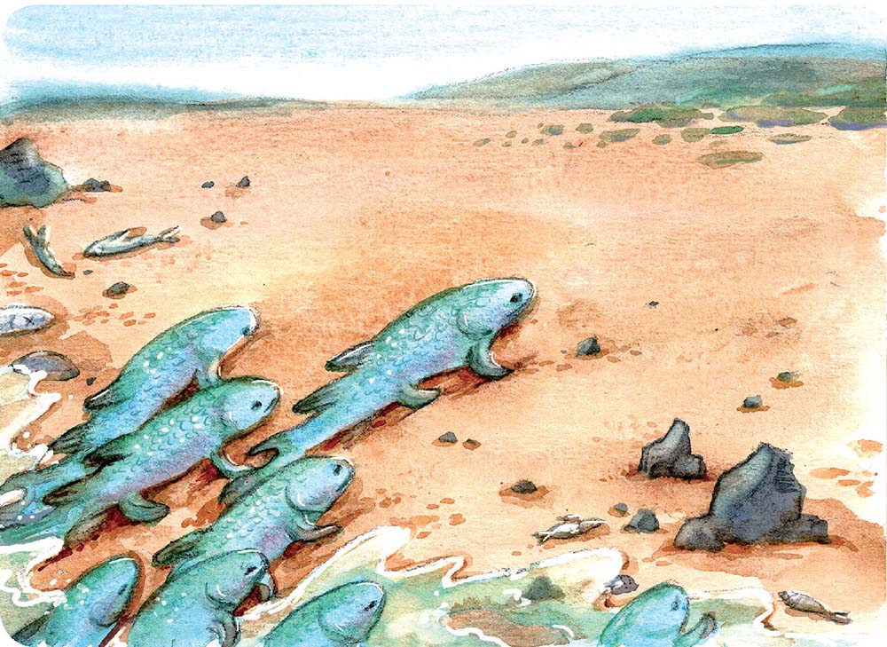 他们爬啊爬啊,毫不停留。一路上,有的不惯爬行死于劳累,有的不堪阳光直晒死于酷热,有的不善陆地呼吸死于窒息。他们经过的路上,遗下了不少死鱼。但是活着的还是只管在爬,爬啊爬啊,向着前面,向着陆地!