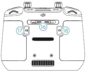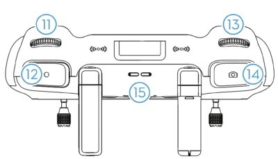 13.云台俯仰控制拨轮: 用于调整云台俯仰角度。按住自定义按键并转动云台俯仰控制拨轮可在探索模式下调节变焦。