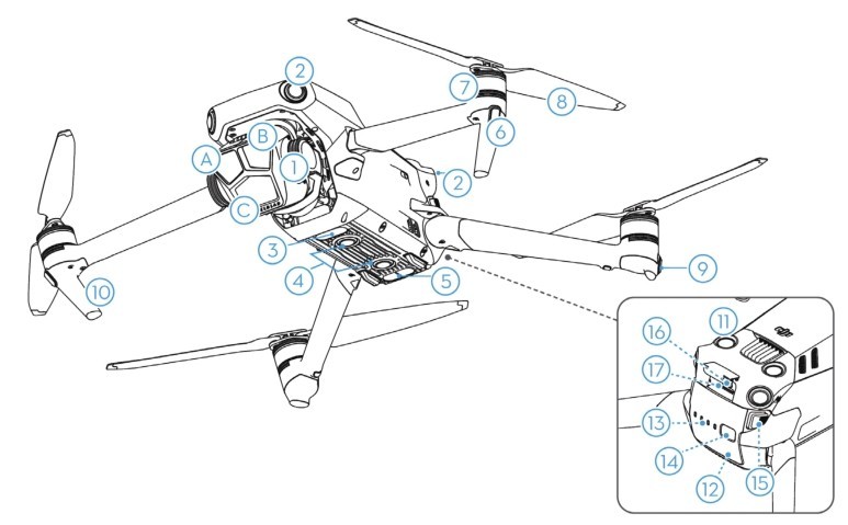 以下为飞行器外观、各部件及按钮的名称及其主要的功能。