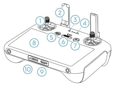 5.摇杆: 可拆卸设计的摇杆,负责操控无人机飞行的动作。在DJI FLY App中可设置摇杆遥控方式。