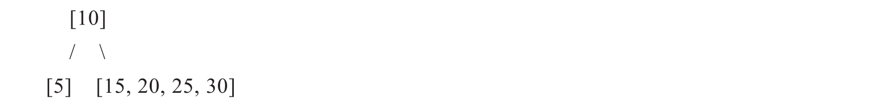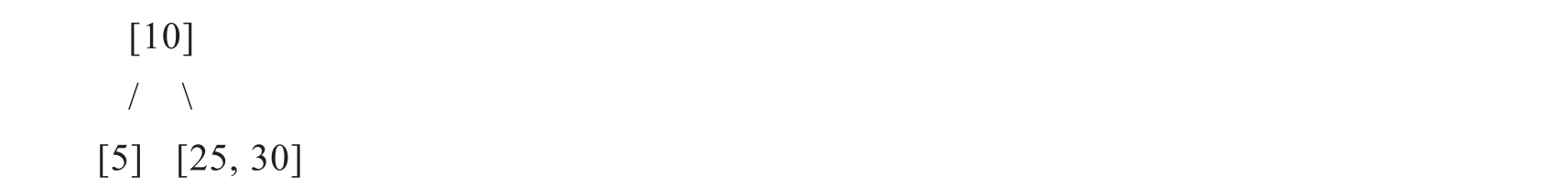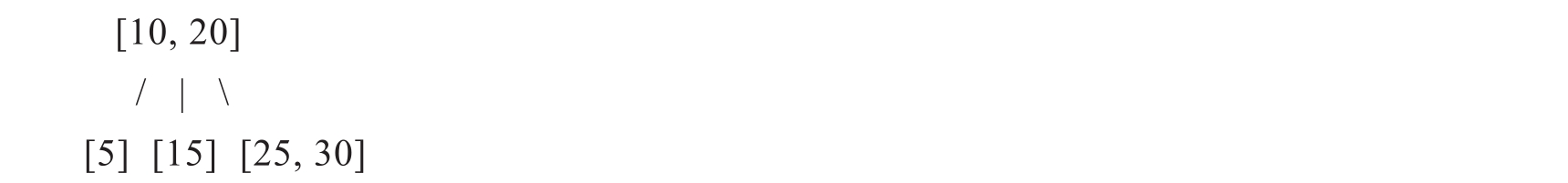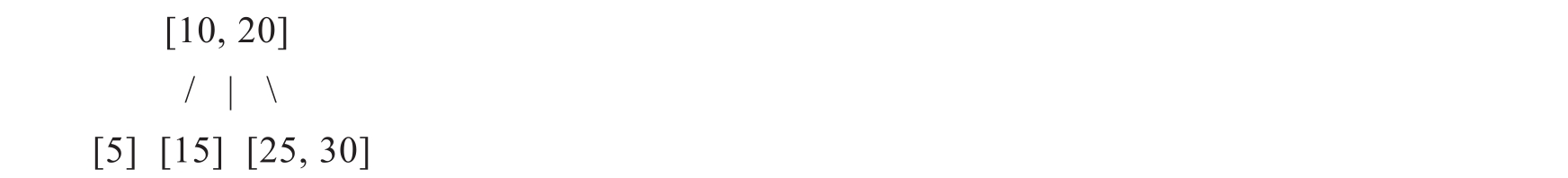 分裂过程:将右侧节点的中间编号20提升到父节点。原右侧节点分裂为两个新节点:[15]和[25,30]。