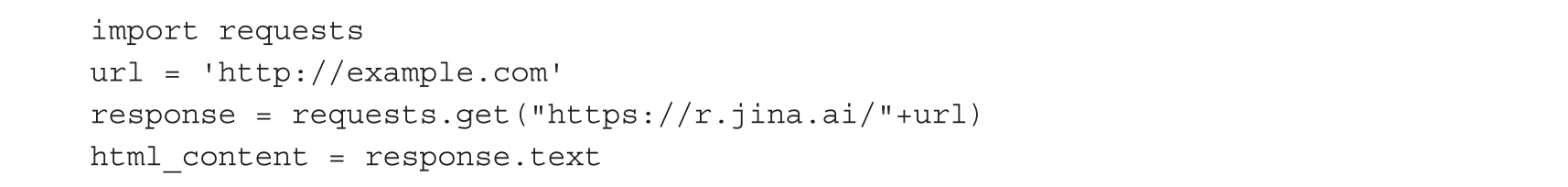 目前Jina是免费使用的,它可以直接返回解析好的网页内容 在需要解析的网页URL前加上“https://r.jina.ai/”,即可返回对应的符合LLM输入的网页内容。例如,若需提取网页的URL是“http://example.com”,那么使用request请求“https://r.jina.ai/http://example.com”即可。