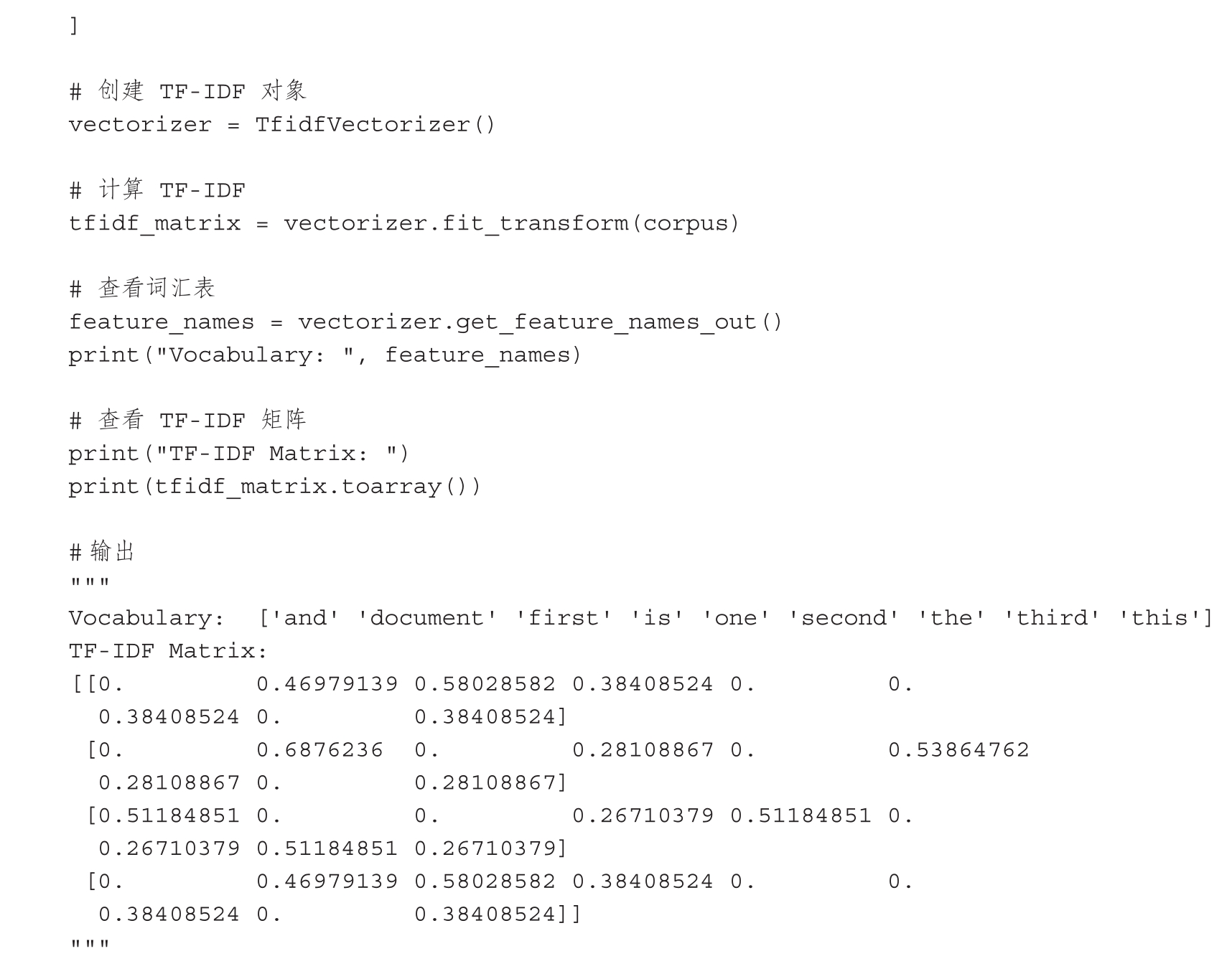 TF-IDF(Term Frequency-Inverse Document Frequency,词频-逆文档频率) 是一种常用于信息检索与文本挖掘的加权技术,用以评估词语在文档集或语料库的特定文档中的重要程度。在文本处理中,TF-IDF常用于关键词提取、文档相似度计算等任务。在Python中,可以使用scikit-learn库来计算TF-IDF值。
